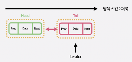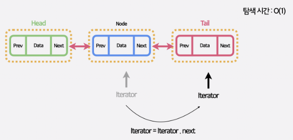 - 이미 정의되어 있던 iterator를 유지하며, 근방에 있는 노드(앞 : interator.prev, 뒤 : iterator.next)를 삽입하고 삭제하는 것이 가능하므로 탐색에 O(1)이 소요됨