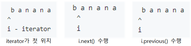System.out.print(it.previous()); // previous는 앞으로 이동함과 동시에 값을 반환해줌 ('c')