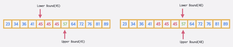 찾는 값 target이 배열에 여러 개 있다면, 이진탐색을 돌렸을 때 어떤 위치가 나오게 될지는 아무도 모릅니다. 이때 lower bound와 upper bound를 활용하면, 특정 값이 존재하는 구간을 알 수 있습니다. [lower bound, upper bound)