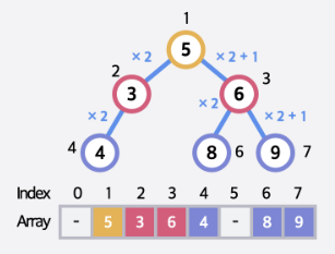 - 배열로도 구현이 가능(0번 인덱스 값은 비우고 루트 노드를 1번에 넣고 시작)하며, 자식이 없는 경우 배열에도 칸을 비워둡니다.