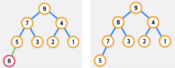 - 완전 이진트리를 만족시킬 수 있게, 트리의 맨 끝 값을 루트로 올립니다.