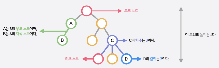 - 깊이: 루트 노드와 얼마나 떨어져 있는지를 가리키는 말입니다.