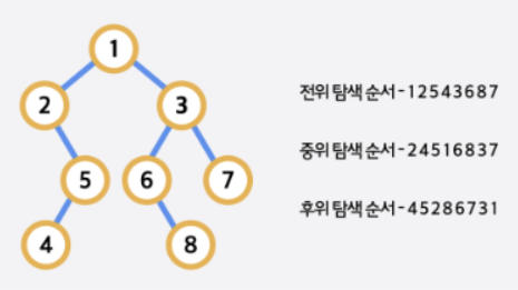- 전위 탐색 : 부모 - 왼쪽 자식 - 오른쪽 자식순으로 탐색합니다. 모든 노드에 대해 부모를 먼저 방문하고, 왼쪽 자식들을 전부 순회하고, 그 이후에 오른쪽 자식들을 순회합니다.