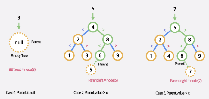 - 트리에 노드가 전혀 없는 경우 : 이때 parent 값은 null이며, 이진 탐색 트리의 루트를 node(x)로 설정해줘야 합니다.