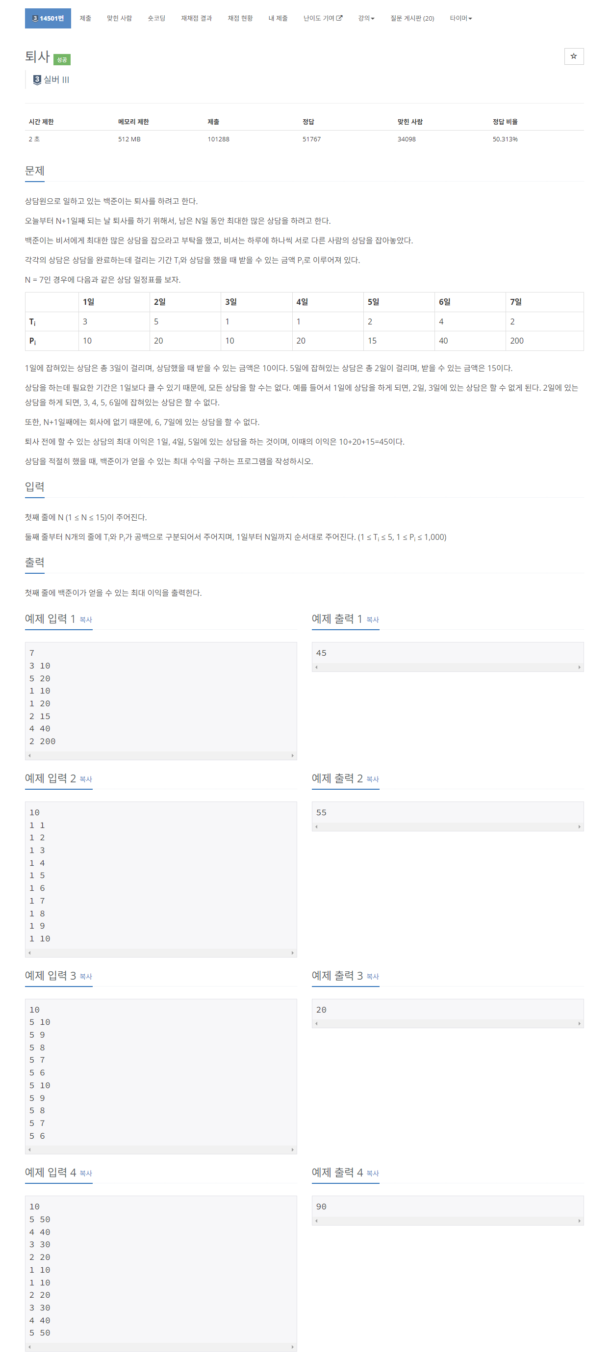 https://www.acmicpc.net/problem/14501